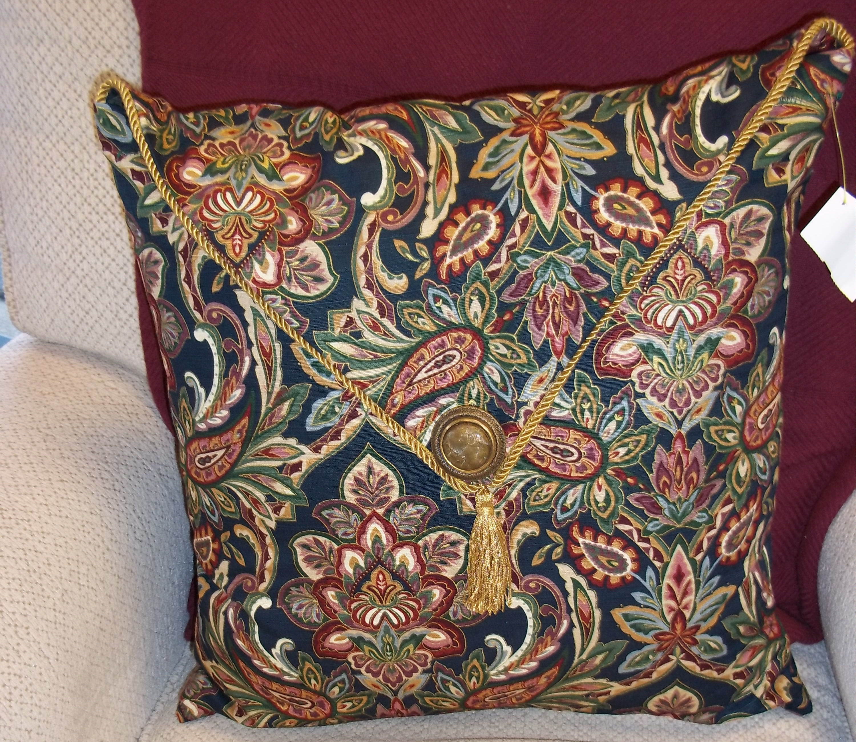 100_0734 May 14, 2013Full resolution (3000 × 2600) ← Previous Next → Morene made this very nice pillow from an rethrifted pillow, fabric and trim.